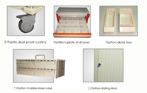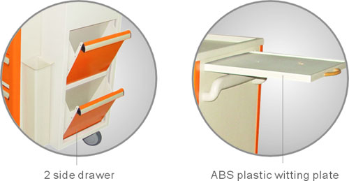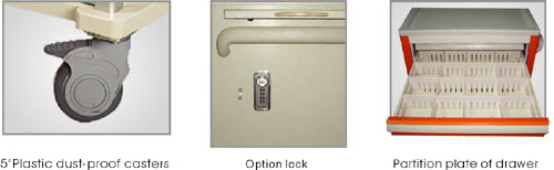 Description : - Cart frame is made of plastic, so easy moving - The handle is made of PU plastic - Partition plate of drawer can adjustable space - The drawer design not noise and easy control - The drawer are anti-slide by moving cart - The witting plate is made of ABS plastic - Option lock - Option PU plastic first-aid plate
